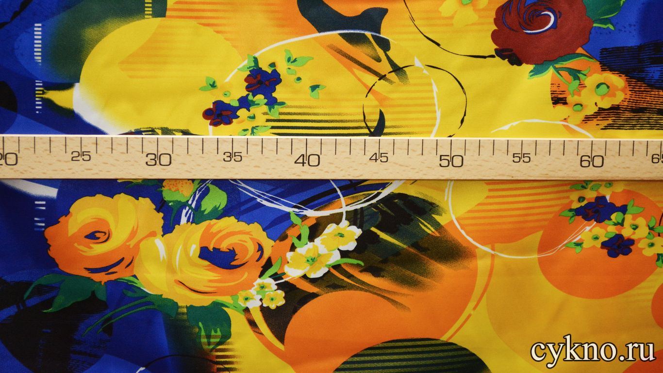 Атлас принт сине-желтые цветы