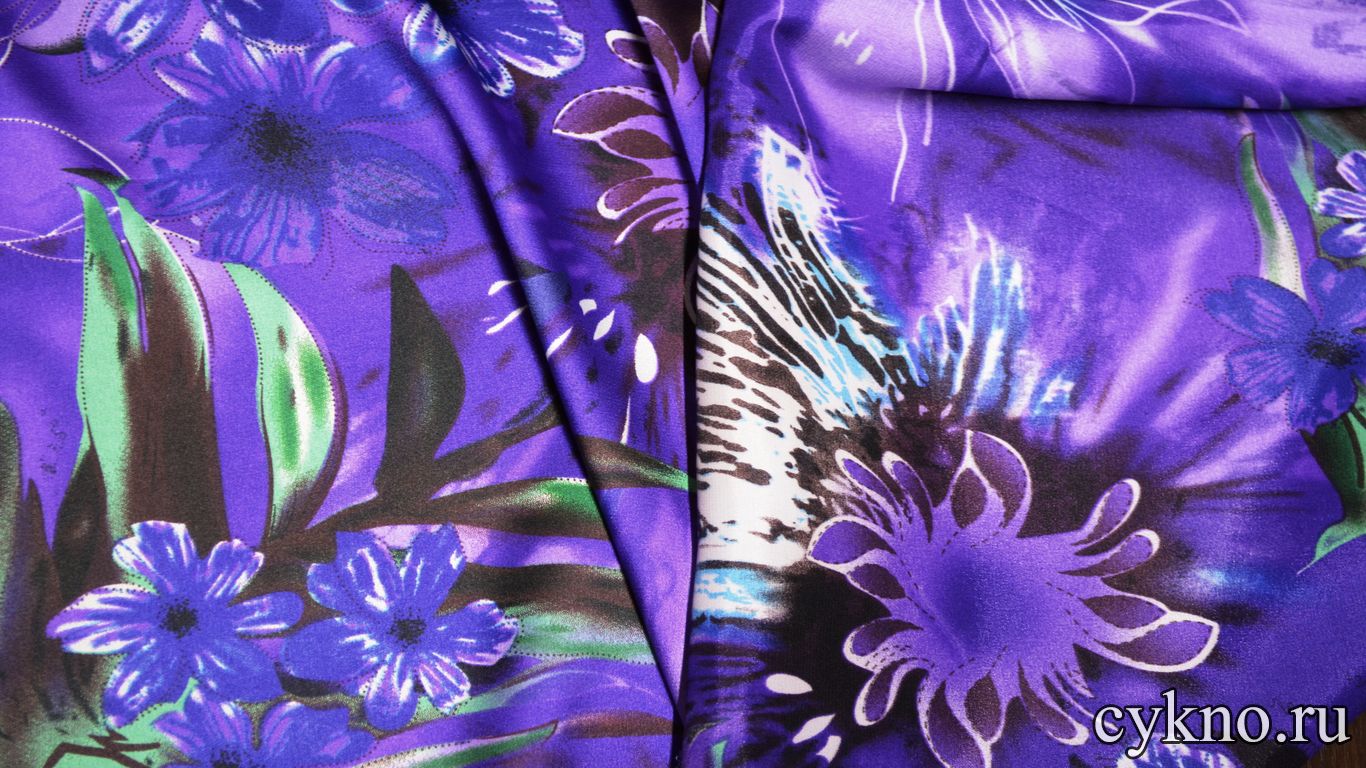 Атлас с цветочным принтом в темно-сиреневом цвете