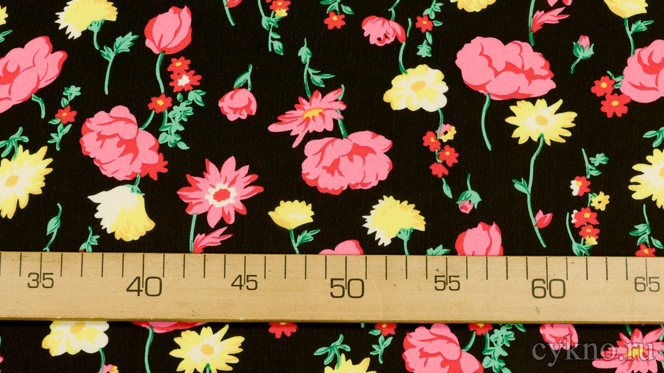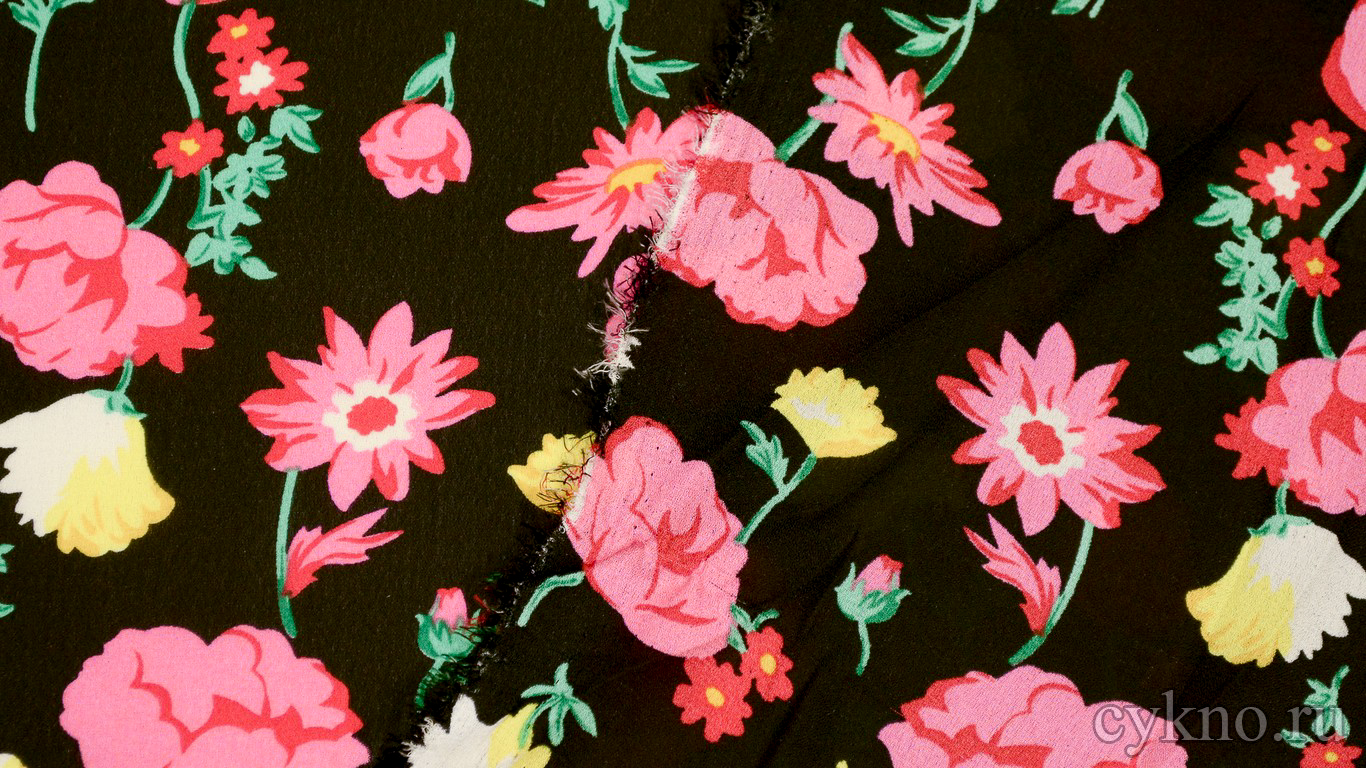 Шифон Набивной "Розовые маки на черном"